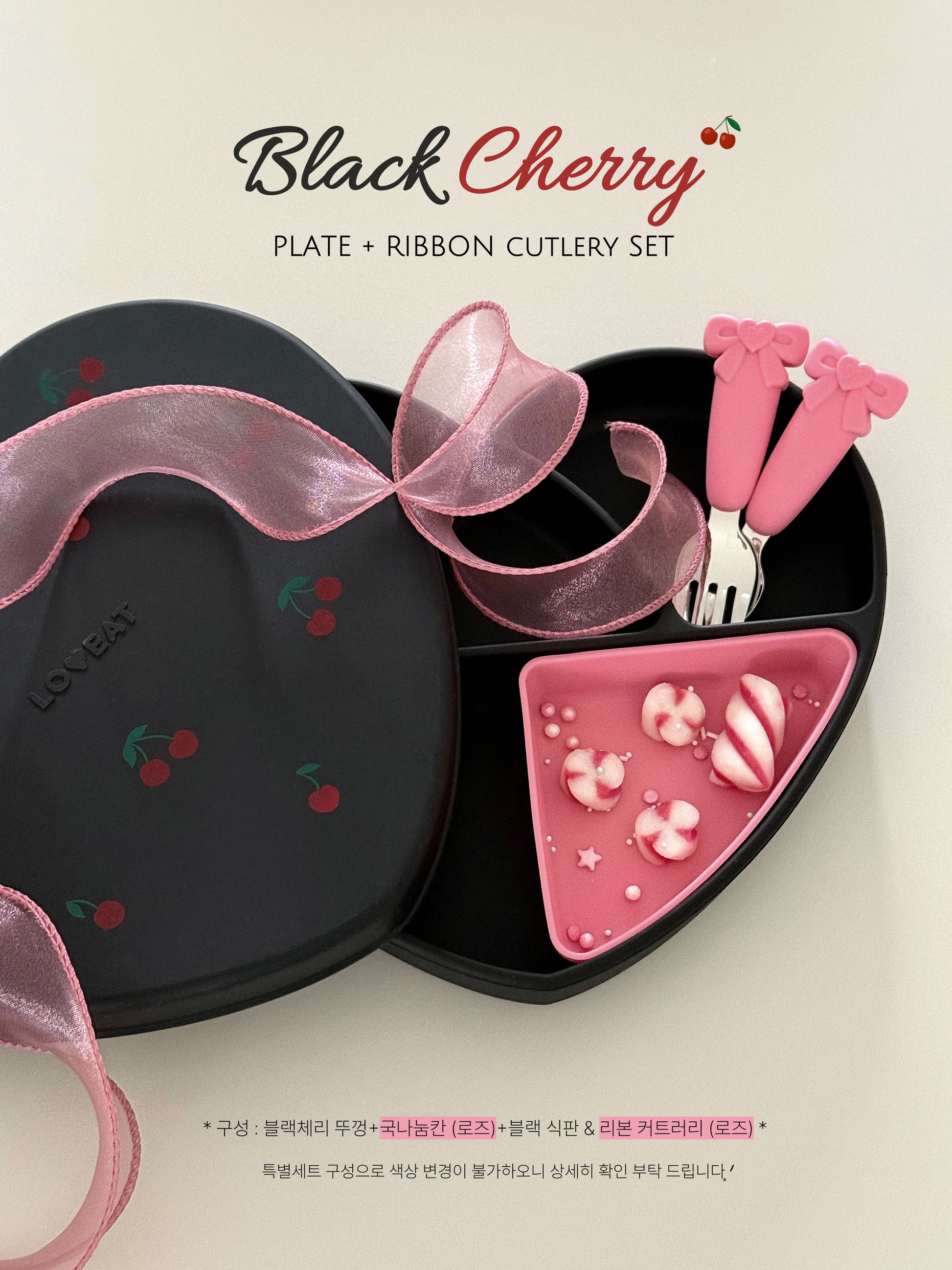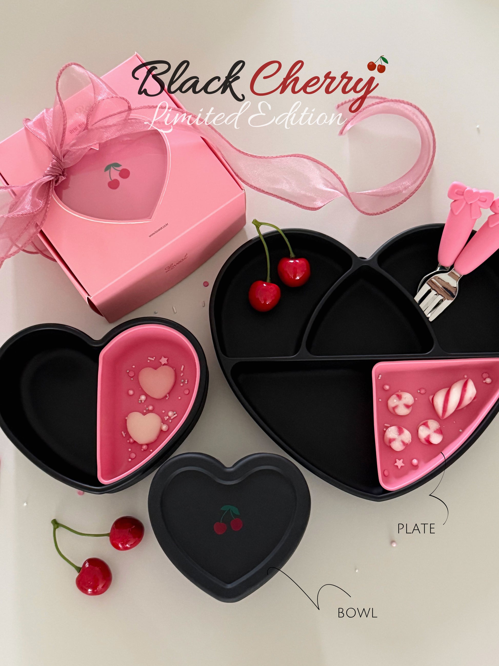 Loveat special limited edition black cherry & pink cherry suction plate set, bowl and lunch box